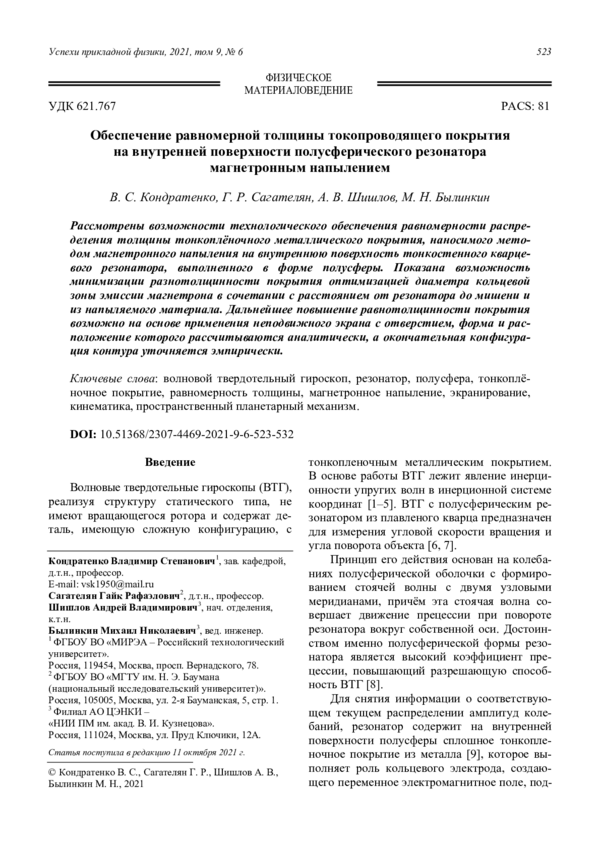 Рассмотрены возможности технологического обеспечения равномерности распределения толщины тонкоплёночного металлического покрытия, наносимого методом магнетронного напыления на внутреннюю поверхность тонкостенного кварцевого резонатора, выполненного в форме полусферы. Показана возможность минимизации разнотолщинности покрытия оптимизацией диаметра кольцевой зоны эмиссии магнетрона в сочетании с расстоянием от резонатора до мишени и из напыляемого материала. Дальнейшее повышение равнотолщинности покрытия возможно на основе применения неподвижного экрана с отверстием, форма и расположение которого рассчитываются аналитически, а окончательная конфигурация контура уточняется эмпирически.