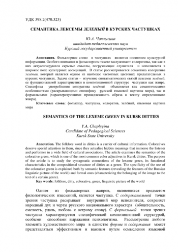 ЧАПЛЫГИНА Ю. А. СЕМАНТИКА ЛЕКСЕМЫ ЗЕЛЁНЫЙ В КУРСКИХ ЧАСТУШКАХ // ЛИНГВОФОЛЬКЛОРИСТИКА. 2024. № 39-1