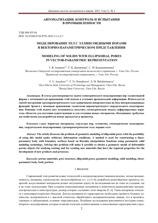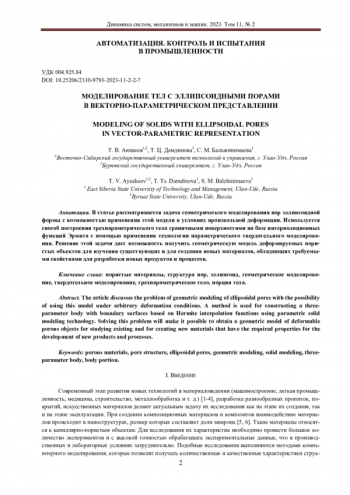 В статье рассматривается задача геометрического моделирования пор эллипсоидной формы с возможностью применения этой модели в условиях произвольной деформации. Используется способ построения трехпараметрического тела граничными поверхностями на базе интерполяционных функций Эрмита с помощью применения технологии параметрического твердотельного моделирования. Решение этой задачи даст возможность получить геометрическую модель деформируемых пористых объектов для изучения существующих и для создания новых материалов, обладающих требуемыми свойствами для разработки новых продуктов и процессов.