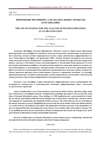 Инсейфинг позволяет формировать, обсуждать задачи из сферы науки, образования, проектирования. Под инсейфингом понимается интеллектуальноемкая интерактивная коммуникативная технология, которая начинает формироваться на базе теории динамических информационных систем. Таким образом, инсейфинг, как приложение ТДИС, обладает большим потенциалом для визуализации мыследеятельности, обобщающего традиционные схемотехники благодаря наличию специальных правил, структур и собственного языка для реинжиниринга и оптимизации бизнес-процессов. В статье рассмотрено применение инсейфинга для анализа бизнес-процессов, выделения процессов, которые должен контролировать и оптимизировать непосредственно собственник. В результате применения инсейфинга для анализа и оптимизации бизнес-процессов организации были получены триады, которые позволяют определить факторы успеха хозяйствующего субъекта в современной экономике. Это квалифицированный персонал, достойное вознаграждение, деление управления на тактический и стратегический уровни, развитые каналы обмена информацией и нематериальная мотивация.