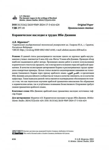 В данной статье рассматривается наследие одного из крупных арабо-мусульманских ученых-лингвистов X века Абу-аль-Фатха ‘Усмана ибн Джинни. Проведен обзор наиболее выдающихся работ автора. Произведен анализ работ в аспекте использования коранического текста как предмета, так и инструмента познания отраслей арабской грамматики. В качестве иллюстрации цитирования Корана в рассматриваемых трудах приведены конкретные примеры. Целью статьи является акцентирование внимания на толковании Священного Корана через призму арабского языка « » и презентация Ибн-Джинни для российского сообщества не только в качестве лингвиста, но и в качестве муфассира. Также выводом данной статьи является подтверждение обоснованности тезиса о том, что как тщательное изучение арабской грамматики невозможно без обращения к кораническим аятам, так и углубленное понимание Божественного Откровения требует знания грамматики арабского языка.