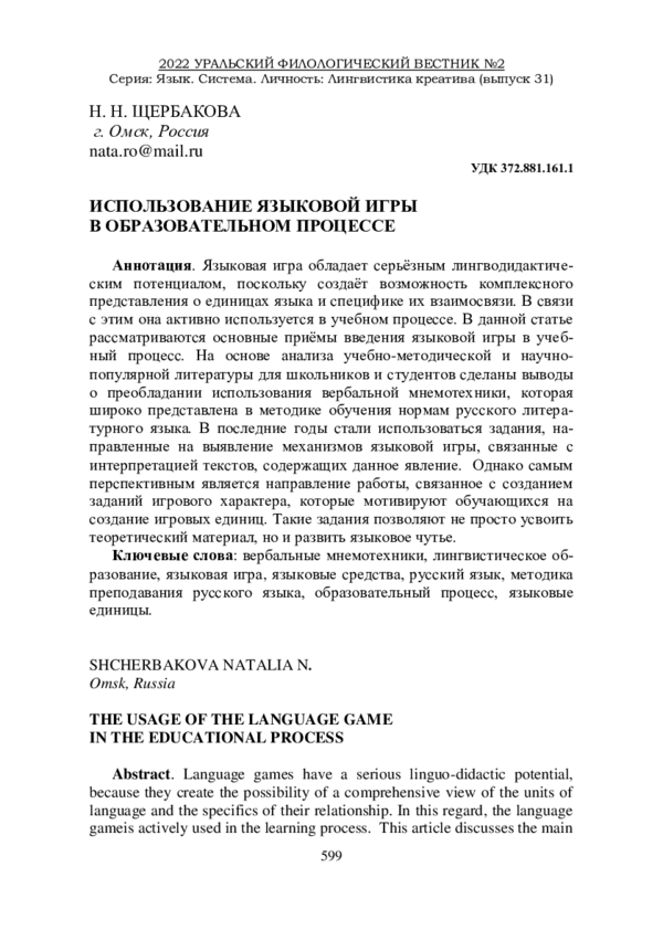 ЩЕРБАКОВА Н. Н. ИСПОЛЬЗОВАНИЕ ЯЗЫКОВОЙ ИГРЫ В ОБРАЗОВАТЕЛЬНОМ ПРОЦЕССЕ // УРАЛЬСКИЙ ФИЛОЛОГИЧЕСКИЙ ВЕСТНИК. СЕРИЯ: ЯЗЫК. СИСТЕМА. ЛИЧНОСТЬ: ЛИНГВИСТИКА КРЕАТИВА. 2022. № 2