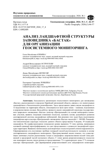 КЛИМИНА Е. М., ОСТРОУХОВ А. В., ФЕТИСОВ Д. М., ЛОНКИНА Е. С. АНАЛИЗ ЛАНДШАФТНОЙ СТРУКТУРЫ ЗАПОВЕДНИКА «БАСТАК» ДЛЯ ОРГАНИЗАЦИИ ГЕОСИСТЕМНОГО МОНИТОРИНГА // ТИХООКЕАНСКАЯ ГЕОГРАФИЯ. 2024. № 1 (17)