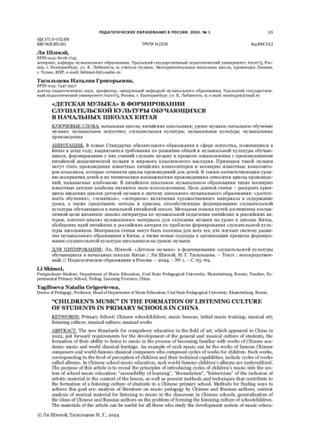 В новых Стандартах обязательного образования в сфере искусства, появившихся в Китае в 2022 году, выдвигаются требования по развитию общей и музыкальной культуры обучающихся, формированию у них умений слушать музыку в процессе ознакомления с произведениями китайской академической музыки и мирового классического наследия. Примером такой музыки могут стать произведения известных китайских композиторов и всемирно известных композиторов-классиков, которые сочиняли циклы произведений для детей. К таким соответствующим уровню восприятия детей и их техническим возможностям произведениям относятся циклы произведений, называемые альбомами. В китайском школьном музыкальном образовании такие всемирно известные детские альбомы являются мало используемыми. Цель данной статьи - раскрыть принципы введения циклов детской музыки в систему школьного музыкального образования: «доступность обучения», «тематизм», «историзм» включения художественного материала в содержание урока, а также представить методы и приемы, способствующие формированию слушательской культуры обучающихся в начальной китайской школе. Методами поиска путей достижения поставленной цели являются: анализ литературы по музыкальной педагогике китайских и российских авторов, контент-анализ музыкального материала для слушания музыки на уроке в школах Китая, обобщение идей китайских и российских авторов по проблеме формирования слушательской культуры школьников. Материалы статьи могут быть полезны для всех тех, кто изучает систему развития музыкального образования в Китае, а также новые подходы к организации процесса формирования слушательской культуры школьников на уроках музыки.
