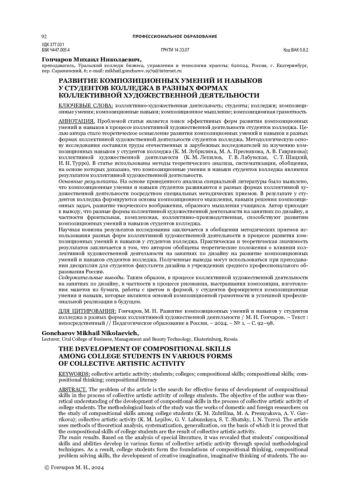 Проблемой статьи является поиск эффективных форм развития композиционных умений и навыков в процессе коллективной художественной деятельности студентов колледжа. Целью автора стало теоретическое осмысление развития композиционных умений и навыков в разных формах коллективной художественной деятельности студентов колледжа. Методологическую основу исследования составили труды отечественных и зарубежных исследователей по изучению композиционных навыков у студентов колледжа (К. М. Зубрилина, М. А. Преснякова, А. В. Гаврикова); коллективной художественной деятельности (К. М. Лепилов, Г. В. Лабунская, С. Т. Шацкий, И. Н. Турро). В статье использованы методы теоретического анализа, систематизации, обобщения, на основе которых доказано, что композиционные умения и навыки студентов колледжа являются результатом коллективной художественной деятельности. Основные результаты. На основе проведенного анализа специальной литературы было выявлено, что композиционные умения и навыки студентов развиваются в разных формах коллективной художественной деятельности посредством специальных методических приемов. В результате у студентов колледжа формируются основы композиционного мышления, навыки решения композиционных задач, развитие творческого воображения, образного мышления учащихся. Автор приходит к выводу, что разные формы коллективной художественной деятельности на занятиях по дизайну, в частности фронтальная, комплексная, коллективно-производственная, способствуют развитию композиционных умений и навыков студентов колледжа. Научная новизна результатов исследования заключается в обобщении методических приемов использования разных форм коллективной художественной деятельности в процессе развития композиционных умений и навыков у студентов колледжа. Практическая и теоретическая значимость результатов заключается в том, что автором обобщены теоретические положения ο влиянии коллективной художественной деятельности на занятиях по дизайну на развитие композиционных умений и навыков студентов колледжа. Полученные выводы могут использоваться при преподавании дисциплин для студентов факультета дизайна в учреждениях среднего профессионального образования России. Содержательные выводы. Таким образом, в процессе коллективной художественной деятельности на занятиях по дизайну, в частности в процессе рисования, выстраивания композиции, изготовления макетов из бумаги, работы с цветом и формой, у студентов формируются композиционные умения и навыки, которые являются основой композиционной грамотности и успешной профессиональной реализации в будущем.