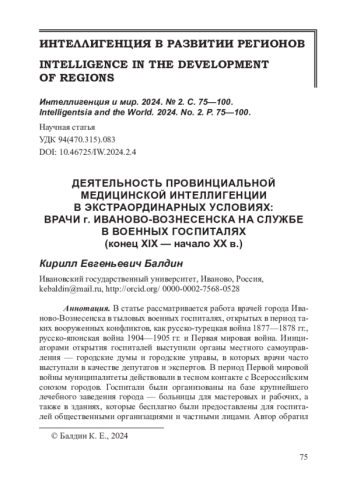 В статье рассматривается работа врачей города Иваново-Вознесенска в тыловых военных госпиталях, открытых в период таких вооруженных конфликтов, как русско-турецкая война 1877—1878 гг., русско-японская война 1904—1905 гг. и Первая мировая война. Инициаторами открытия госпиталей выступили органы местного самоуправления — городские думы и городские управы, в которых врачи часто выступали в качестве депутатов и экспертов. В период Первой мировой войны муниципалитеты действовали в тесном контакте с Всероссийским союзом городов. Госпитали были организованы на базе крупнейшего лечебного заведения города — больницы для мастеровых и рабочих, а также в зданиях, которые бесплатно были предоставлены для госпиталей общественными организациями и частными лицами. Автор обратил особое внимание на процесс создания госпиталей, их финансирование, организацию здесь лечения и быта раненых и больных воинов. Большую роль в обеспечении материальной базы госпиталей играли богатые местные промышленники. В статье рассматривается профессиональная
