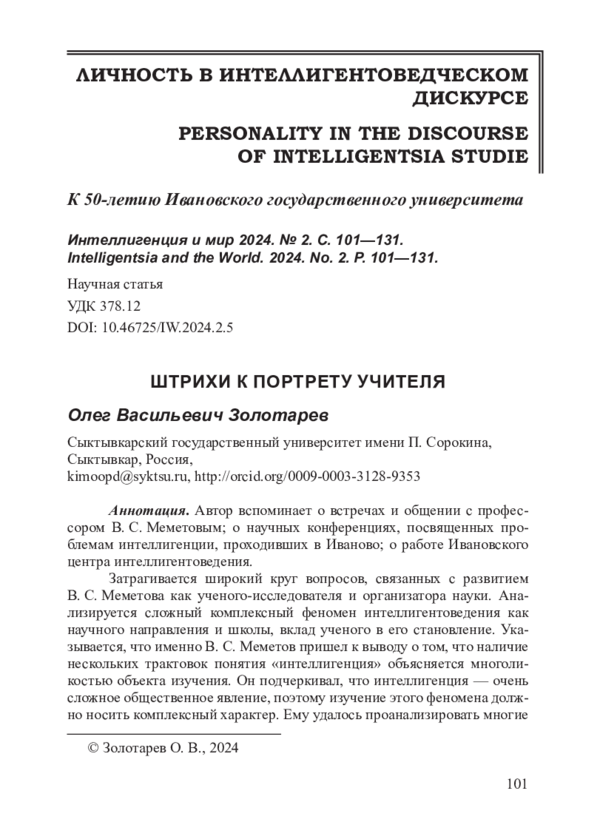 ЗОЛОТАРЕВ О. В. ШТРИХИ К ПОРТРЕТУ УЧИТЕЛЯ // ИНТЕЛЛИГЕНЦИЯ И МИР. 2024. № 2
