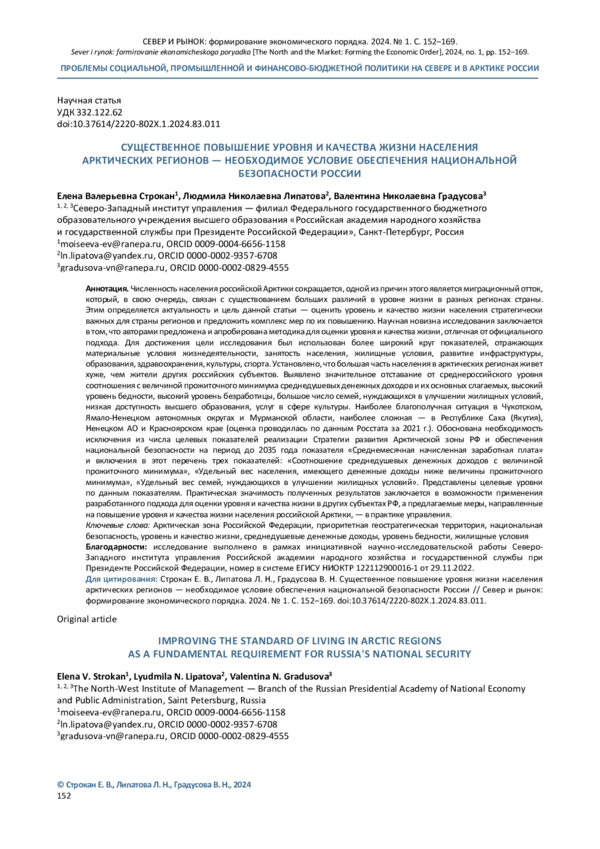- Липатова Л. Н., Градусова В. Н., Строкан Е. В. Статистическая оценка достижения стратегической цели по продолжительности жизни населения арктических регионов России // Север и рынок: формирование экономического порядка. 2023. № 3. С. 93–108. https://doi:10.37614/2220-802X.3.2023.81.006.