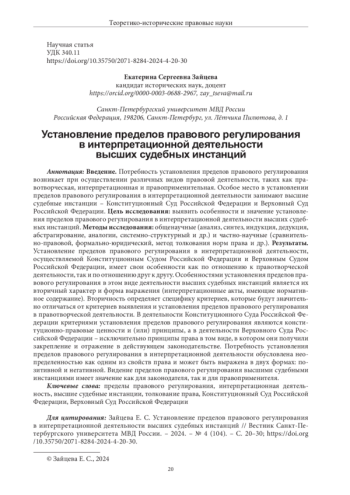 Введение. Потребность установления пределов правового регулирования возникает при осуществлении различных видов правовой деятельности, таких как правотворческая, интерпретационная и правоприменительная. Особое место в установлении пределов правового регулирования в интерпретационной деятельности занимают высшие судебные инстанции - Конституционный Суд Российской Федерации и Верховный Суд Российской Федерации. Цель исследования: выявить особенности и значение установления пределов правового регулирования в интерпретационной деятельности высших судебных инстанций.