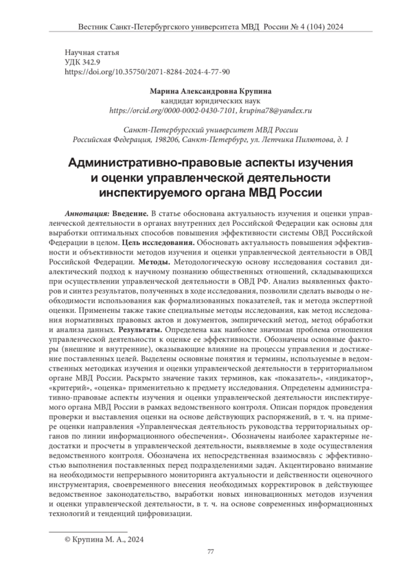 Ульянов А. Д. Научный инструментарий оценки эффективности управленческой деятельности в территориальных органах МВД России // Труды Академии управления МВД России. - 2022. - № 1 (61). - С. 48-60;. DOI: 10.24412/2072-9391-2022-161-48-60 EDN: QRCROC