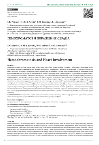 Гемохроматоз при отсутствии терапии представляет собой опасное для жизни состояние, связанное с избыточным содержанием железа в организме. Выделяют первичный (наследственный) гемохроматоз, возникающий в результате мутаций генов, и вторичный (приобретенный) в результате чрезмерного потребления или поступления железа с пищей или в составе лекарственных препаратов, заболеваний печени или многократных гемотрансфузий. Отложение избытка железа в паренхиматозных тканях приводит к клеточной дисфункции и клиническим проявлениям заболевания. Чаще всего поражаются печень, поджелудочная железа, суставы, кожа, гипофиз и сердце. Гемохроматоз сердца в ряде случаев приводит к развитию сердечной недостаточности, которую потенциально возможно предотвратить. Первоначально развивается диастолическая дисфункция и нарушения ритма, на более поздних стадиях — картина дилатационной кардиомиопатии. Выявить признаки поражения сердца при гемохроматозе можно с помощью комплексной 2D- и допплеровской эхокардиографии, МРТ сердца с измерением времени релаксации Т2* и других диагностических методов. «Золотым стандартом» диагностики первичного гемохроматоза является генетическое тестирование, которое должно проводиться всем пациентам с подозрением на данную патологию после исключения вторичных причин перегрузки железом. Основу терапии гемохроматоза составляют лечебная флеботомия и хелатирование железа. Средняя продолжительность жизни у нелеченых пациентов с гемохроматозом и тяжелой сердечной недостаточностью не превышает одного года. Однако при раннем и агрессивном лечении выживаемость приближается к таковой у пациентов с сердечной недостаточностью другой этиологии.