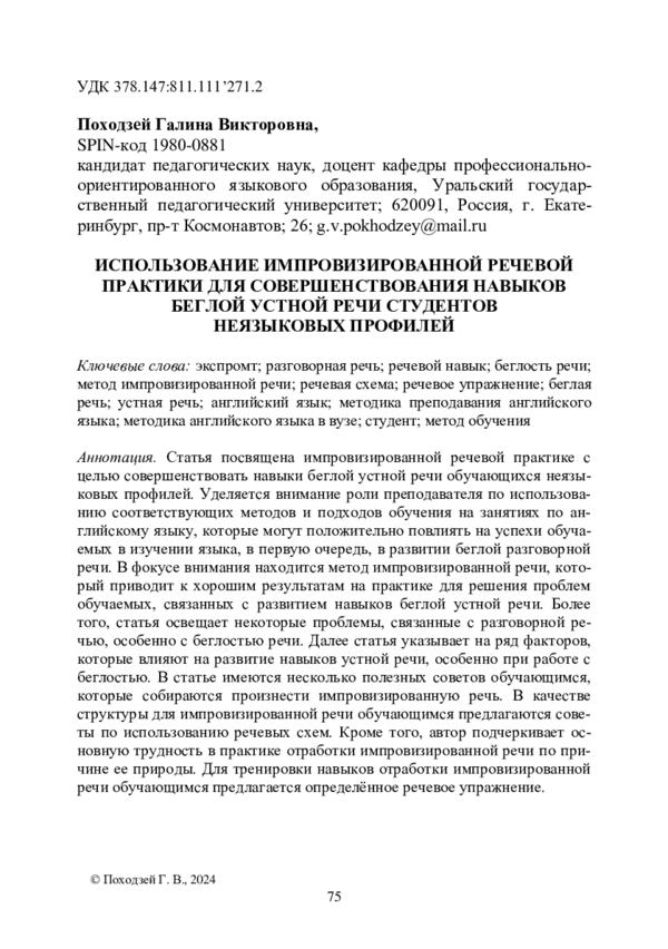 ПОХОДЗЕЙ Г. В. ИСПОЛЬЗОВАНИЕ ИМПРОВИЗИРОВАННОЙ РЕЧЕВОЙ ПРАКТИКИ ДЛЯ СОВЕРШЕНСТВОВАНИЯ НАВЫКОВ БЕГЛОЙ УСТНОЙ РЕЧИ СТУДЕНТОВ НЕЯЗЫКОВЫХ ПРОФИЛЕЙ // АКТУАЛЬНЫЕ ПРОБЛЕМЫ ГЕРМАНИСТИКИ, РОМАНИСТИКИ И РУСИСТИКИ. 2024. № 1