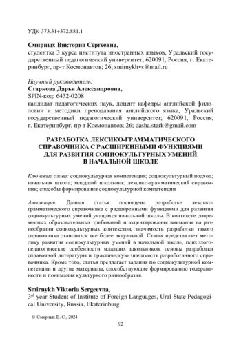 Данная статья посвящена разработке лексико-грамматического справочника с расширенными функциями для развития социокультурных умений учащихся начальной школы. В контексте современных образовательных требований и акцентирования внимания на разнообразии социокультурных контекстов, значимость разработки такого справочника становится все более актуальной. Статья представляет методику развития социокультурных умений в начальной школе, психолого-педагогические особенности младших школьников, основы разработки справочной литературы и практическую значимость разработанного справочника. Кроме того, статья предлагает задания по социокультурной компетенции и другие материалы, способствующие формированию толерантности и понимания культурного разнообразия.
