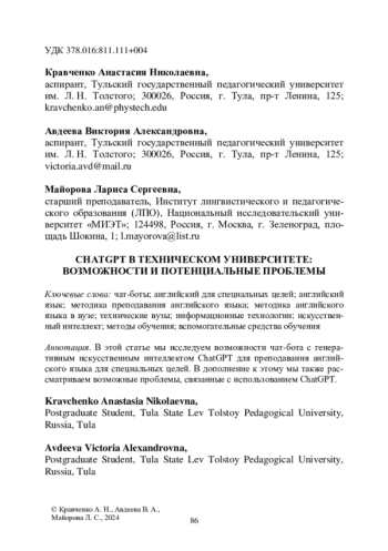 Использование ChatGPT в учебном процессе технического университета для обучения ESP предоставляет уникальные возможности для интерактивного, творческого и индивидуализированного обучения. Однако важно учитывать потенциальные проблемы и риски, связанные с использованием данной технологии, и постоянно оценивать ее эффективность с учетом потребностей и целей обучения. Важно найти баланс и ограничить использование чат-ботов лишь как вспомогательных инструментов, не заменяющих полностью взаимодействие преподавателя и учащегося. Дальнейшие исследования и эксперименты могут помочь определить наилучшие подходы к интеграции ChatGPT в процесс обучения английскому языку в техническом университете.
