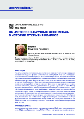 На материале открытия кварков, рассматриваемого в контексте истории создания стандартной модели в физике элементарных частиц 1950-1970-х гг., исследуются особенности соответствующих исторических процессов, которые именуются «историко-научными феноменами». Эти феномены являются квазиэмпирическими обобщениями, которые фиксируются посредством «исторического (или историко-научного) наблюдения». В результате оказалось возможным выявить следующие связанные между собой «историко-научные феномены»: «одновременное и независимое» открытие, наличие одного лидера (в данном случае это М. Гелл-Манн), упущенные возможности, рост исследовательской программы меньшинства, скрытые поворотные моменты, тесно связанный с ним феномен «спящей красавицы», «ошибочностный» характер развития научного знания, «переплетение физики и метафизики». Ставится вопрос об универсальности этих феноменов и утверждается, что внесение теоретизма в историю науки возможно только при их учёте. Кроме того, понимаемые как особенности современной теории элементарных частиц и фундаментальных взаимодействий между ними, они могут рассматриваться как уроки истории, которые могут оказаться полезными в дальнейшем её развитии этой теории.