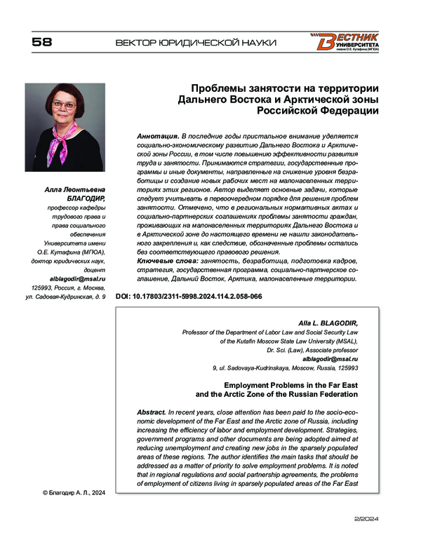 БЛАГОДИР А. Л. ПРОБЛЕМЫ ЗАНЯТОСТИ НА ТЕРРИТОРИИ ДАЛЬНЕГО ВОСТОКА И АРКТИЧЕСКОЙ ЗОНЫ РОССИЙСКОЙ ФЕДЕРАЦИИ // ВЕСТНИК УНИВЕРСИТЕТА ИМЕНИ О.Е. КУТАФИНА (МГЮА). 2024. № 2