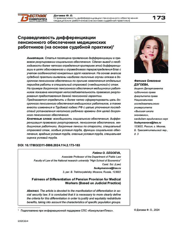 Статья посвящена проявлению дифференциации в правовом регулировании социального обеспечения. Сделан вывод о необходимости более четкого определения критериев этой дифференциации в целях обоснованного и справедливого перераспределения благ с учетом особенностей конкретных групп населения. На основе анализа судебной практики выявлены наиболее типичные случаи отказа в досрочном пенсионном обеспечении по причине невключения отдельных периодов работы в специальный страховой («медицинский») стаж. На примере досрочного пенсионного обеспечения медицинских работников показана некоторая непоследовательность правового регулирования предоставления данной пенсионной гарантии. Предлагается определить и более четко сформулировать цель досрочного пенсионного обеспечения медицинских работников, а также внести изменения в Трудовой кодекс РФ с целью уточнения последствий установления неполного рабочего времени для целей досрочного пенсионного обеспечения.