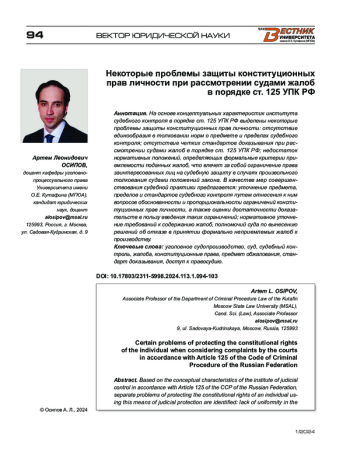 На основе концептуальных характеристик института судебного контроля в порядке ст. 125 УПК РФ выделены некоторые проблемы защиты конституционных прав личности: отсутствие единообразия в толковании норм о предмете и пределах судебного контроля; отсутствие четких стандартов доказывания при рассмотрении судами жалоб в порядке ст. 125 УПК РФ; недостаток нормативных положений, определяющих формальные критерии приемлемости поданных жалоб, что влечет за собой ограничение права заинтересованных лиц на судебную защиту в случаях произвольного толкования судами положений закона. В качестве мер совершенствования судебной практики предлагается: уточнение предмета, пределов и стандартов судебного контроля путем отнесения к ним вопросов обоснованности и пропорциональности ограничений конституционных прав личности, а также оценки достаточности доказательств в пользу введения таких ограничений; нормативное уточнение требований к содержанию жалоб, полномочий суда по вынесению решений об отказе в принятии формально неприемлемых жалоб к производству.