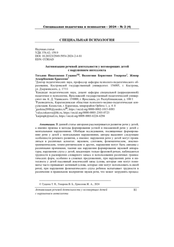 В данной статье авторами рассматривается развитие речи у детей, а именно приемы и методы формирования устной и письменной речи у детей с ментальными нарушениями. Обобщая исследования, посвященные формированию речи у детей с ментальными нарушениями, авторы выделяют следующие особенности речевого развития, а именно: нарушения речи у детей могут проявляться в различных аспектах: звуковом, слоговом, фонематическом, лексико-грамматическом, темпо-ритмическом и других, нарушения могут быть связаны с различными причинами, такими как нарушения формирования звуковой аппаратуры, нарушения слуха у детей, владеющих только фразовой речью, наблюдаются трудности в расширении словарного запаса и использовании различных грамматических форм, особенно в сложных предложениях, при нарушениях речи и интеллекта у детей пассивный лексический запас (слова, которые они могут понимать) часто превышает активный (слова, которые они могут использовать в своей речи), при нарушении фонематического слуха ребенок испытывает трудности в различении и правильном восприятии звуков речи, что может затруднять процесс овладения грамотой. При глубокой форме нарушения интеллекта может возникнуть серьезное нарушение понимания обращенной речи, при тяжелых формах нарушения интеллекта речь может быть очень слабо развита и не выполняет коммуникативную функцию. В работе подробно описаны результаты диагностики речи у детей с нарушением интеллекта, а также последующая работа по коррекции данного процесса. Представленные в программе разделы и их содержание (игровые упражнения) являются основой для осуществления дифференцированного подхода, работы в определенной последовательности (по этапам), для применения вариативных технологий.