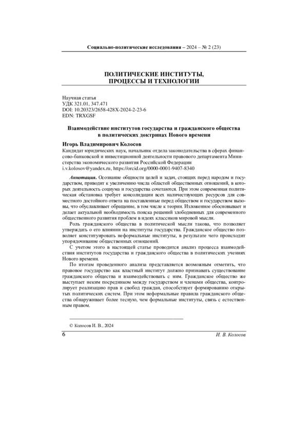 КОЛОСОВ И. В. ВЗАИМОДЕЙСТВИЕ ИНСТИТУТОВ ГОСУДАРСТВА И ГРАЖДАНСКОГО ОБЩЕСТВА В ПОЛИТИЧЕСКИХ ДОКТРИНАХ НОВОГО ВРЕМЕНИ // СОЦИАЛЬНО-ПОЛИТИЧЕСКИЕ ИССЛЕДОВАНИЯ. 2024. № 2