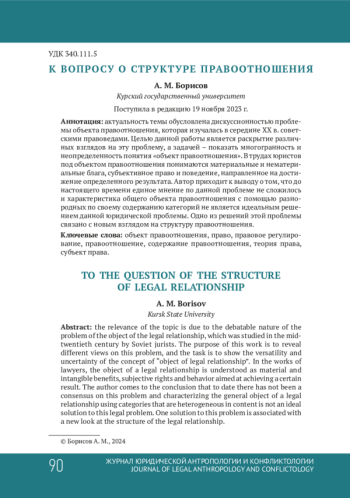 Borisov A. M. On the issue of the content of the legal relationship / A. M. Borisov // Administrative and municipal law. - 2014. - No. 11. - P. 1125-1132. 10.7256/1999- 2807.2014.11.12449. DOI: 10.7256/1999-2807.2014.11.12449 EDN: SZHWEN