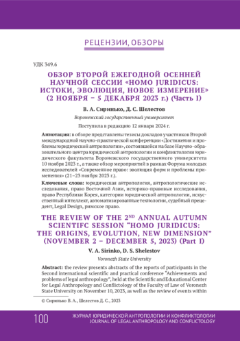 В обзоре представлены тезисы докладов участников Второй международной научно-практической конференции «Достижения и проблемы юридической антропологии», состоявшейся на базе Научно-образовательного центра юридической антропологии и конфликтологии юридического факультета Воронежского государственного университета 10 ноября 2023 г., а также обзор мероприятий в рамках Форума молодых исследователей «Современное право: эволюция форм и проблемы применения» (21-23 ноября 2023 г.).