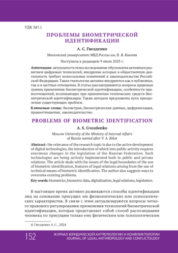 В настоящее время активно развиваются способы идентификации лиц на основании присущих им физиологических или психологических характеристик. В связи с этим актуализируются вопросы четкого правового регулирования применения технологий биометрической идентификации, которая представляет собой способ распознавания человека по присущим только ему физическим или психологическим признакам.