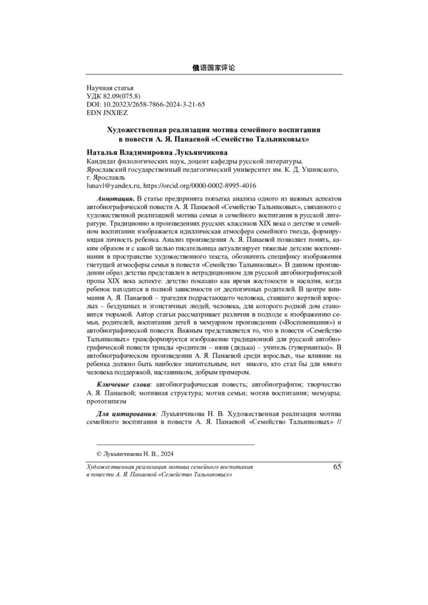 Лукьянчикова Н. В. “Ты под своим родимым кровом врагов озлобленных нашла…”: мотив семьи в повести А. Я. Панаевой “Семейство Тальниковых”) // “Нежданный, как цветок над бездной, очаг семейный и уют…”: семейный дискурс русской и мировой литературы / под науч. ред. Е. М. Болдыревой. Ярославль: РИО ЯГПУ, 2020. С. 101-110.