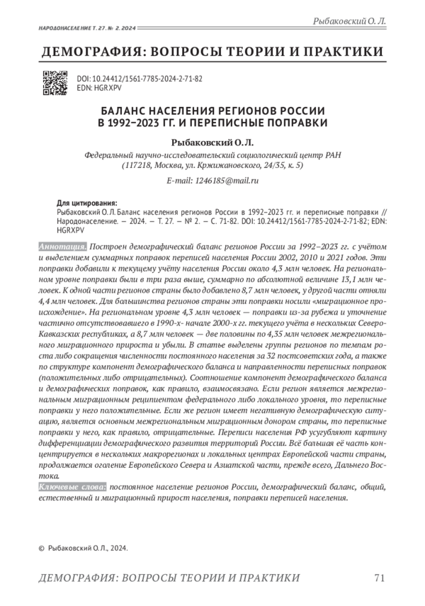 - Рыбаковский, О. Л. Возрастная структура населения регионов России в начале XXI века: компоненты формирования / О. Л. Рыбаковский // Народонаселение. - 2023. - Т. 26. - № 1. - С. 4-15. ;. DOI: 10.19181/population.2023.26.1.1 EDN: JIZLYM Rybakovsky O. L. Vozrastnaya struktura naseleniya regionov Rossii v nachale 21 veka: komponenty formirovaniya [The age structure of the population of the regions of Russia at the beginning of the 21st century: components of the formation]. Narodonaselenie [Population]. 2023. Vol. 26. No. 1. P. 4-15. 10.19181/population.2023.26.1.1 (in Russ.). DOI: 10.19181/population.2023.26.1.1(inRuss.) EDN: JIZLYM