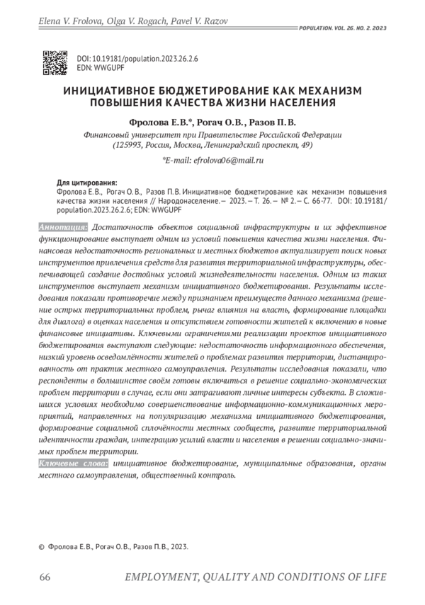 ФРОЛОВА Е. В., РОГАЧ О. В., РАЗОВ П. В. ИНИЦИАТИВНОЕ БЮДЖЕТИРОВАНИЕ КАК МЕХАНИЗМ ПОВЫШЕНИЯ КАЧЕСТВА ЖИЗНИ НАСЕЛЕНИЯ // НАРОДОНАСЕЛЕНИЕ. 2023. ТОМ 26 № 2