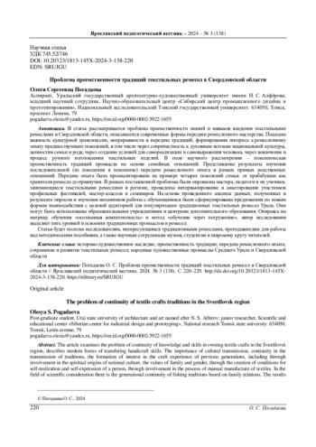 В статье рассматривается проблема преемственности знаний и навыков владения текстильными ремеслами в Свердловской области, описываются современные формы передачи ремесленного мастерства. Показана важность культурной трансмиссии, непрерывности в передаче традиций, формирования интереса к ремесленному опыту предшествующих поколений, в том числе через сопричастность к духовным истокам национальной культуры, ценностям семьи и рода, через создание условий для самореализации и самовыражения человека, через вовлечение в процесс ручного изготовления текстильных изделий. В поле научного рассмотрения - поколенческая преемственность традиций промысла на основе семейных отношений. Представлены результаты изучения последовательной (из поколения в поколение) передачи ремесленного опыта в рамках прямых родственных отношений. Передача опыта была проанализирована на примере четырех поколений семьи: от прабабушки как хранителя ремесла до правнучки. В рамках поставленной проблемы были опрошены мастера, педагоги и их ученики, занимающиеся текстильными ремеслами в регионе, проведены интервьюирование и анкетирование участников профильных фестивалей, мастер-классов и семинаров. На основе проведенного анализа данных, полученных в результате опросов и изучения механизмов работы с обучающимися были сформулированы предложения по новым формам взаимодействия с целевой аудиторией для популяризации традиционных текстильных ремесел Урала. Они могут быть использованы образовательными учреждениями и центрами дополнительного образования. Опираясь на матрицу обучения «осознанная компетентность» и метод «обучение через погружение», автор исследования выделяет пять уровней в освоении традиционных промыслов и ремесел. Статья будет полезна исследователям, интересующимся традиционными ремеслами, преподавателям для работы над методическими пособиями, а также научным сотрудникам музеев, студентам и широкому кругу читателей.
