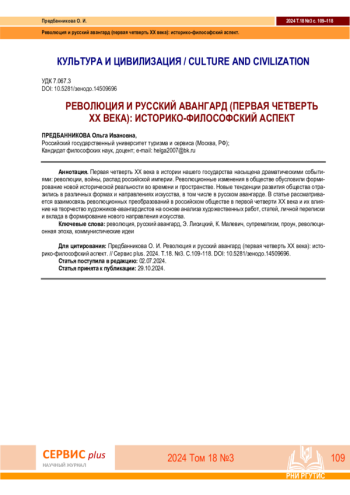 Первая четверть XX века в истории нашего государства насыщена драматическими событиями: революции, войны, распад российской империи. Революционные изменения в обществе обусловили формирование новой исторической реальности во времени и пространстве. Новые тенденции развития общества отразились в различных формах и направлениях искусства, в том числе в русском авангарде. В статье рассматривается взаимосвязь революционных преобразований в российском обществе в первой четверти ХХ века и их влияние на творчество художников-авангардистов на основе анализа художественных работ, статей, личной переписки и вклада в формирование нового направления искусства.