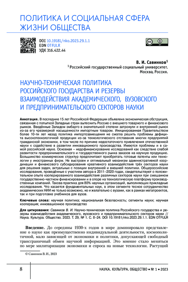 В последние 15 лет Российской Федерации объявлена экономическая обструкция, связанная с попыткой Западных стран вытеснить Россию с внешнего товарного и финансового рынков. Введённые Западом эмбарго в значительной степени затронули и внутренний рынок из-за его чрезмерной насыщенности импортным товаром. Инициированная Правительством более 10-ти лет назад политика импортозамещения не смогла решить проблемы дефицита высокотехнологичной продукции из-за технологического отставания многих предприятий гражданской экономики, в том числе по причине недостаточного привлечения отечественной науки к содействию в развитии инновационного производства. Имеются проблемы и в самой российской науке. Основная- недофинансирование исследований как следствие слабой развитости предпринимательского и государственного рынка заказов на научную продукцию. Большинство коммерческих структур предпочитают приобретать готовые патенты или технологии у иностранных фирм. Не выстроен и оптимальный механизм административной координации и финансового субсидирования креативного взаимодействия трёх секторов науки для решения задач, актуальных с позиции внутренней и внешней политики. Общероссийские исследования, проведённые с участием автора в 2011-2020 годах, свидетельствуют о положительном опыте кооперированного взаимодействия различных секторов науки при смешанном государственно-частном финансировании и в опоре на технологическую платформу производственных компаний. Такова практика для 80% научных организаций, выполняющих прикладные исследования. Что касается фундаментальных наук, в этом сегменте тесное сотрудничество академических НИИ не только возможно, но и желательно с вузами, как в рамках мегапроектов, так и при подготовке учебников для вузов.