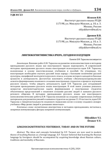 Статья посвящена памяти Е.Ф. Тарасова – крупного ученого, одного из основателей отечественной психолингвистики. Статья состоит из двух подразделов: Тарасов как Ученый и как Учитель. Как ученый он разрабатывал следующие проблемы: 1) проблемы речевого общения; 2) языковое сознание; 3) межкультурная коммуникация; 4) креолизованные тексты; 5) ценностное сознание русских людей; 6) работа над созданием словарей проблемы речевого общения. Как Учитель, Евгений Федорович воспитал целый ряд докторов и не один десяток кандидатов наук. Параллельно научной деятельности, он читал лекции студентам.