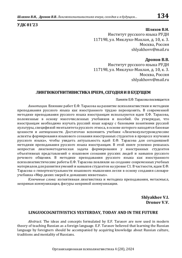 Статья посвящена научной деятельности доктора филологических наук, профессора Евгения Фёдоровича Тарасова (1935–2024), выдающегося лингвиста и исследователя, чьи труды оказали значительное влияние на развитие этнопсихолингвистики и организационной психолингвистики. В статье анализируются ранние публикации Е.Ф. Тарасова, в которых он исследует национально-культурную специфику языковой коммуникации, взаимодействие речевых и неречевых компонентов, а также роль языка в когнитивных процессах. Особое внимание уделяется его попыткам синтезировать теорию речевых действий с философией языка, включая идеи Л.С. Выготского, А.А. Леонтьева и неогумбольдтианцев. Хотя работы Е.Ф. Тарасова тех лет и были адаптированы к господствующей в СССР идеологии, они содержат оригинальные концептуальные подходы, такие, как исследование «поля значениЙ» и его соотношения с «полем смыслов», интерпретация социальных ролей в коммуникации. Эти идеи легли в основу новых направлений психолингвистики и продолжают вдохновлять современных исследователей. Автор делится воспоминаниями о совместной работе и дискуссиях с Евгением Фёдоровичем, акцентируя внимание на его интерпретации идей неогумбольдтианцев и влиянии классических трудов на его взгляды. Статья также описывает яркие эпизоды из жизни замечательного лингвиста, которые иллюстрируют его человечность и юмор, дополняя образ выдающегося учёного.