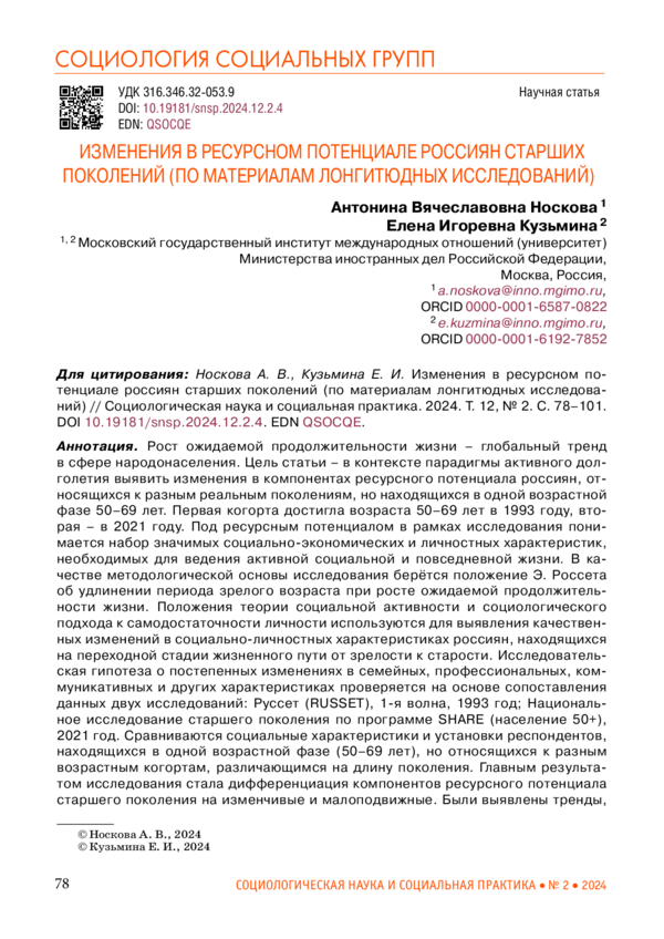 Рост ожидаемой продолжительности жизни - глобальный тренд в сфере народонаселения. Цель статьи - в контексте парадигмы активного долголетия выявить изменения в компонентах ресурсного потенциала россиян, относящихся к разным реальным поколениям, но находящихся в одной возрастной фазе 50-69 лет. Первая когорта достигла возраста 50-69 лет в 1993 году, вторая - в 2021 году. Под ресурсным потенциалом в рамках исследования понимается набор значимых социально-экономических и личностных характеристик, необходимых для ведения активной социальной и повседневной жизни. В качестве методологической основы исследования берётся положение Э. Россета об удлинении периода зрелого возраста при росте ожидаемой продолжительности жизни. Положения теории социальной активности и социологического подхода к самодостаточности личности используются для выявления качественных изменений в социально-личностных характеристиках россиян, находящихся на переходной стадии жизненного пути от зрелости к старости. Исследовательская гипотеза о постепенных изменениях в семейных, профессиональных, коммуникативных и других характеристиках проверяется на основе сопоставления данных двух исследований: Руссет (RUSSET), 1-я волна, 1993 год; Национальное исследование старшего поколения по программе SHARE (население 50+), 2021 год. Сравниваются социальные характеристики и установки респондентов, находящихся в одной возрастной фазе (50-69 лет), но относящихся к разным возрастным когортам, различающимся на длину поколения. Главным результатом исследования стала дифференциация компонентов ресурсного потенциала старшего поколения на изменчивые и малоподвижные. Были выявлены тренды, отражающие качественные изменения ресурсного потенциала россиян старших поколений. Их нельзя однозначно охарактеризовать как позитивные или негативные. В контексте обозначенной проблемы самое значимое изменение связано с повышением уровня образования россиян старших поколений. Сдерживает ресурсный потенциал россиян старших поколений ригидность установок на пенсионный возраст и профессиональную занятость. В заключение делается вывод, что результаты, полученные в ходе исследования, могут служить дополнительной основой для практической реализации задач, связанных с мобилизацией человеческого ресурса россиян старших поколений.