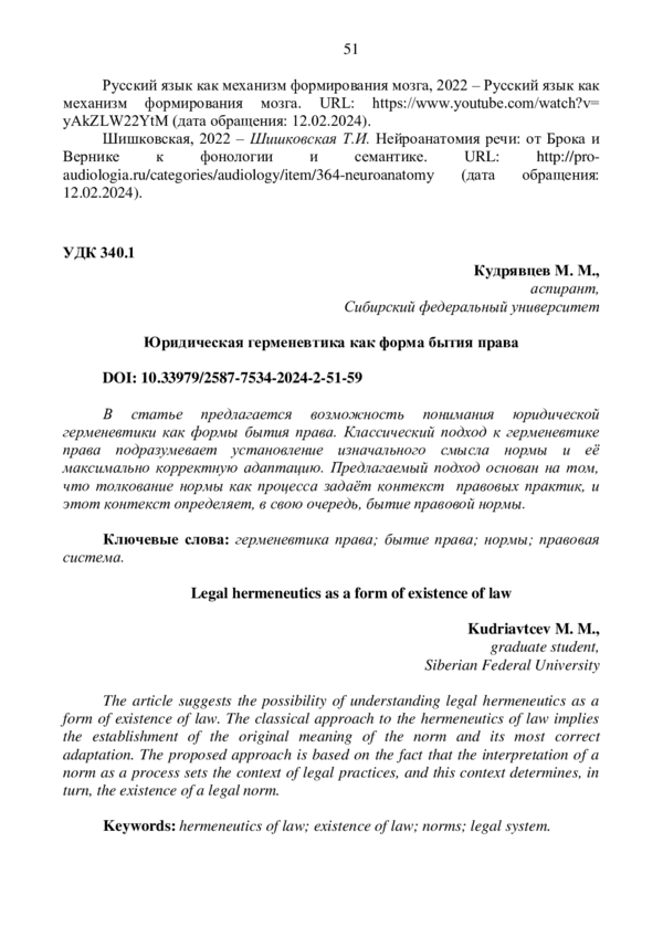 8. Овчинникова, Шаганян, 2021 - Овчинникова О.Д., Шаганян А. М. “Герменевтика” и “экзегетика” как оригинальные (нетипичные) подходы к толкованию права // Философия права. 2021. №2 (97). С. 39-42.