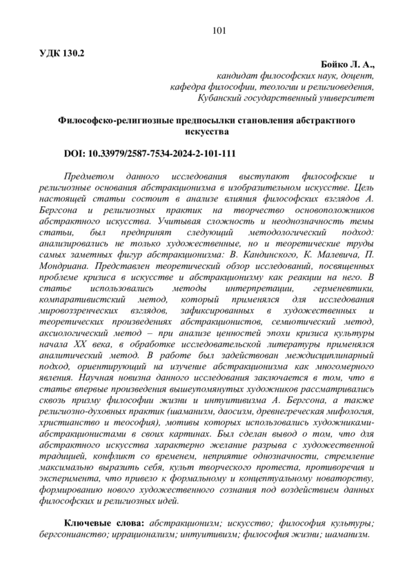 Предметом данного исследования выступают философские и религиозные основания абстракционизма в изобразительном искусстве. Цель настоящей статьи состоит в анализе влияния философских взглядов А. Бергсона и религиозных практик на творчество основоположников абстрактного искусства. Учитывая сложность и неоднозначность темы статьи, был предпринят следующий методологический подход: анализировались не только художественные, но и теоретические труды самых заметных фигур абстракционизма: В. Кандинского, К. Малевича, П. Мондриана. Представлен теоретический обзор исследований, посвященных проблеме кризиса в искусстве и абстракционизму как реакции на него. В статье использовались методы интерпретации, герменевтики, компаративистский метод, который применялся для исследования мировоззренческих взглядов, зафиксированных в художественных и теоретических произведениях абстракционистов, семиотический метод, аксиологический метод - при анализе ценностей эпохи кризиса культуры начала ХХ века, в обработке исследовательской литературы применялся аналитический метод. В работе был задействован междисциплинарный подход, ориентирующий на изучение абстракционизма как многомерного явления. Научная новизна данного исследования заключается в том, что в статье впервые произведения вышеупомянутых художников рассматривались сквозь призму философии жизни и интуитивизма А. Бергсона, а также религиозно-духовных практик (шаманизм, даосизм, древнегреческая мифология, христианство и теософия), мотивы которых использовались художниками-абстракционистами в своих картинах. Был сделан вывод о том, что для абстрактного искусства характерно желание разрыва с художественной традицией, конфликт со временем, неприятие однозначности, стремление максимально выразить себя, культ творческого протеста, противоречия и эксперимента, что привело к формальному и концептуальному новаторству, формированию нового художественного сознания под воздействием данных философских и религиозных идей.