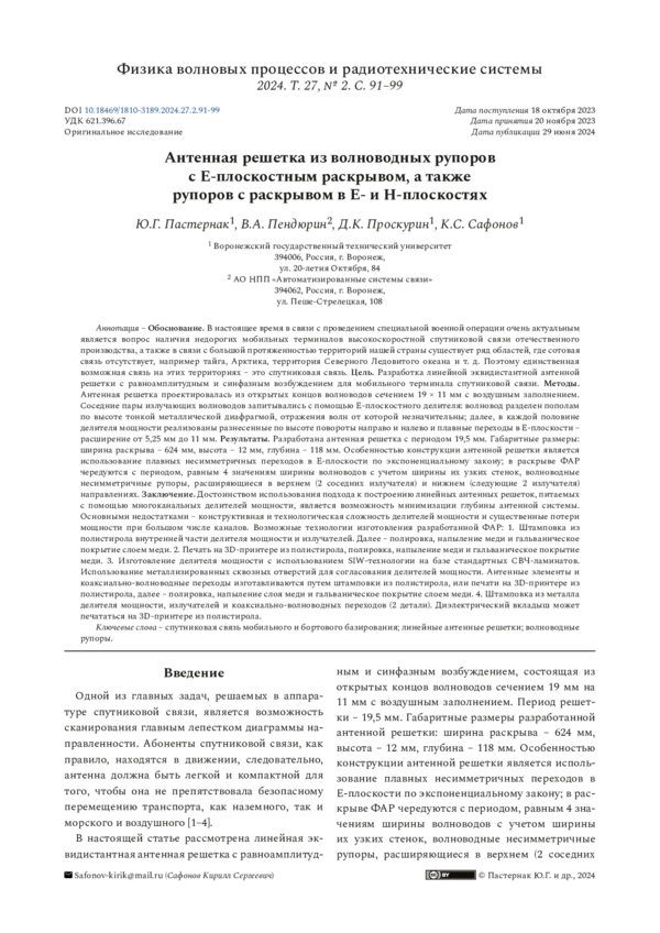 Методы. Антенная решетка проектировалась из открытых концов волноводов сечением 19 × 11 мм с воздушным заполнением. Соседние пары излучающих волноводов запитывались с помощью Е-плоскостного делителя: волновод разделен пополам по высоте тонкой металлической диафрагмой, отражения волн от которой незначительны; далее, в каждой половине делителя мощности реализованы разнесенные по высоте повороты направо и налево и плавные переходы в Е-плоскости - расширение от 5,25 мм до 11 мм.