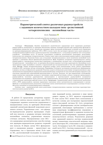 Обоснование. Наличие возможности аналитического определения части параметров различных радиоустройств, оптимальных по критерию обеспечения заданных значений модулей и фаз передаточных функций на необходимом количестве частот, значительно уменьшает время численной оптимизации остальной части параметров по критерию формирования требуемых АЧХ и ФЧХ в полосе частот. До настоящего времени такие задачи решались в отношении радиоустройств только с одним каскадом типа «нелинейная часть - согласующее устройство» или «согласующее устройство - нелинейная часть». В качестве согласующего устройства использовались реактивные, резистивные, комплексные или смешанные четырехполюсники. Решена также задача многокаскадных радиоустройств с реактивными четырехполюсниками. Изменение базиса для согласующих четырехполюсников и места включения нелинейной части приводит к изменению области физической реализуемости.