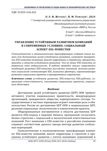 1. Рамзаев В. М., Журова Л. И. Современные аспекты управления устойчивым развитием компаний на основе ESG-инструментов // Вектор науки Тольяттинского государственного университета. Серия: Экономика и управление. 2023. № 4. С. 19-29. DOI: 10.18323/2221-5689-2023-4-19-29 EDN: DPHUGE