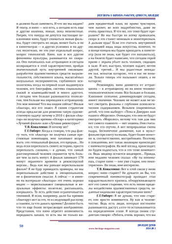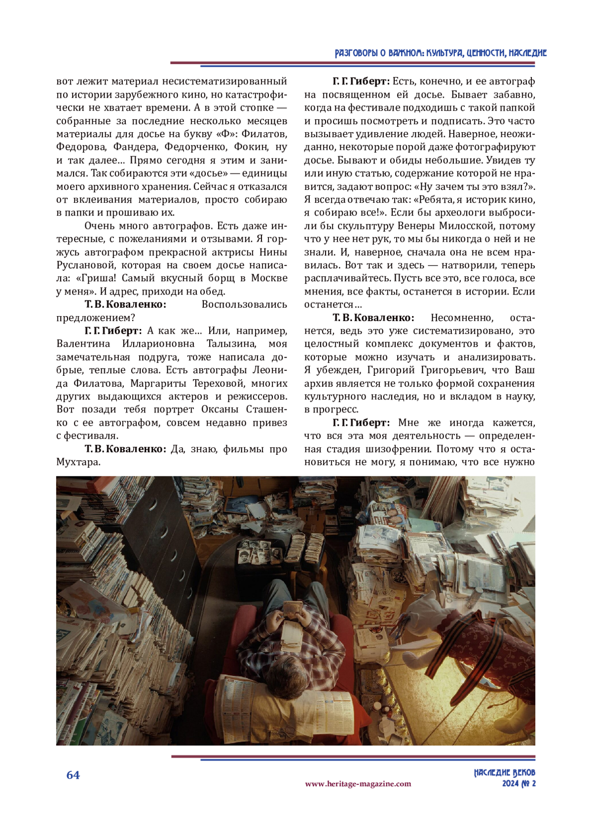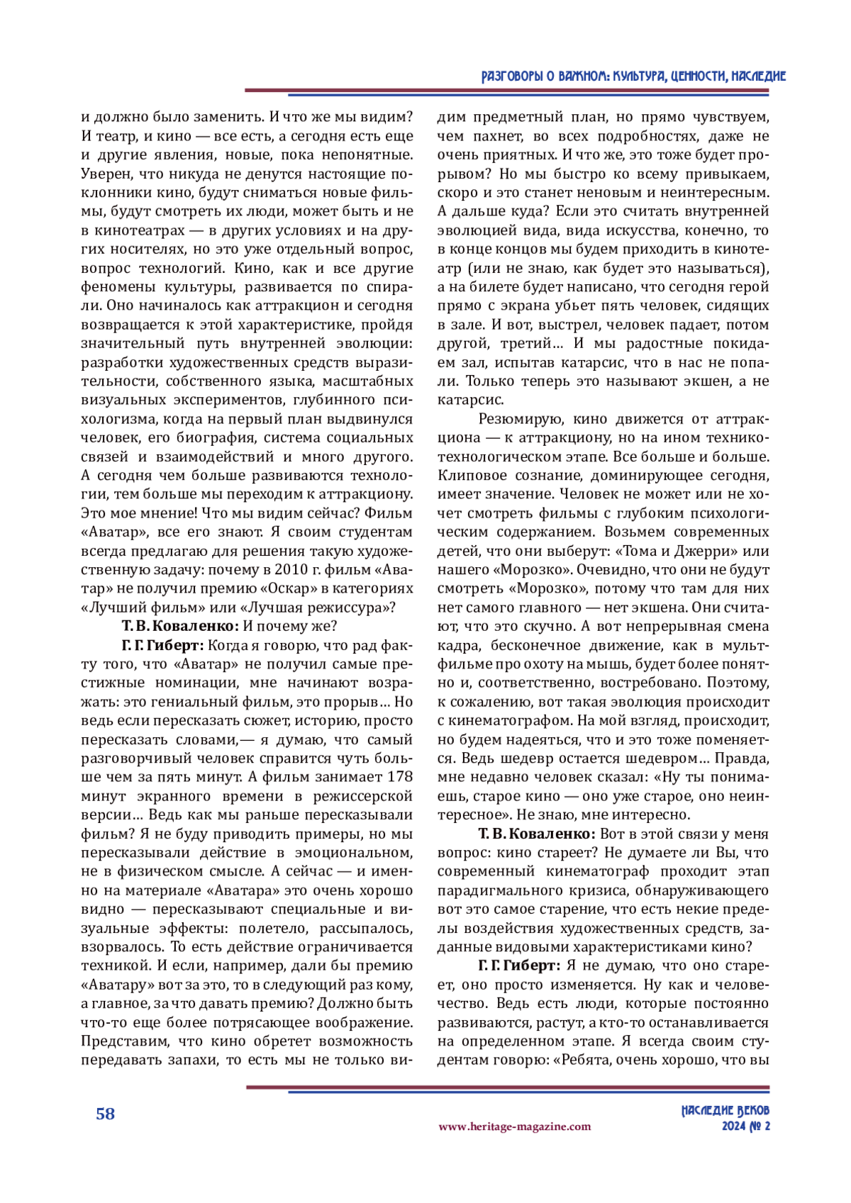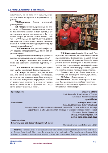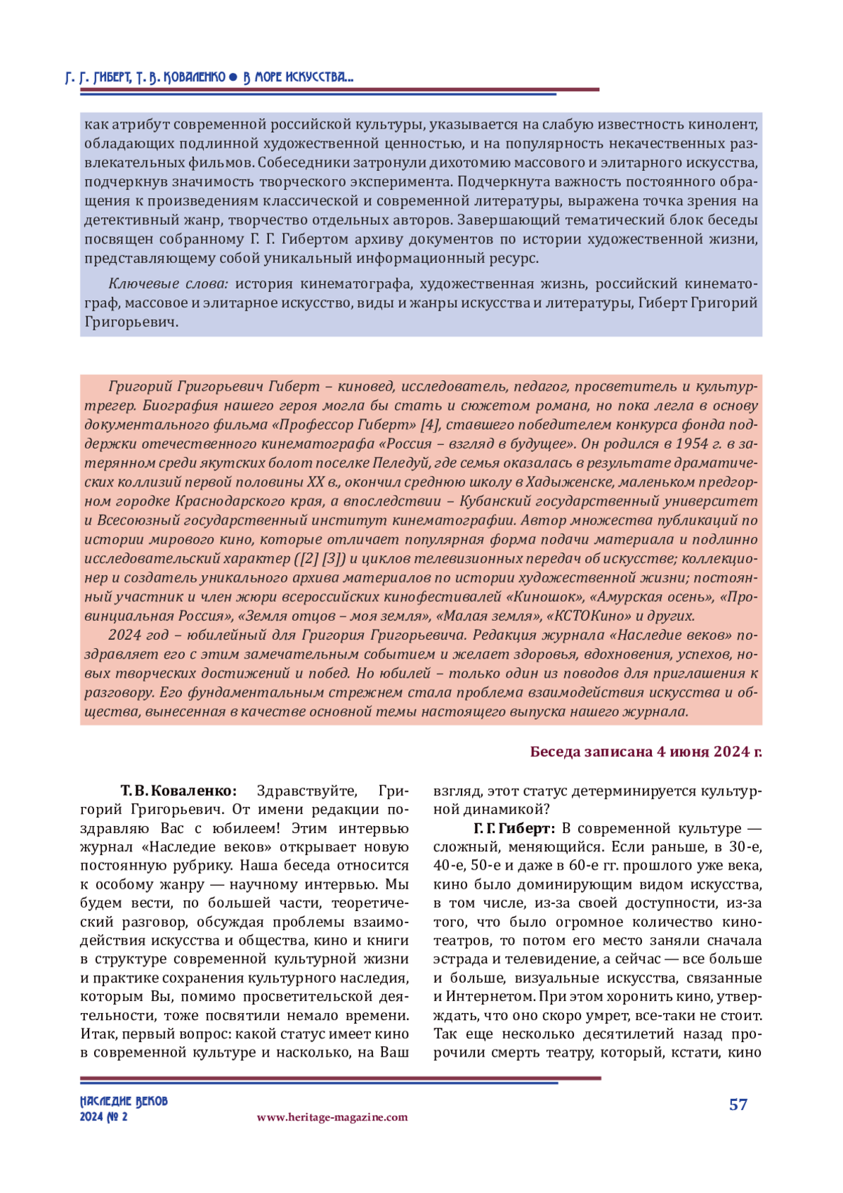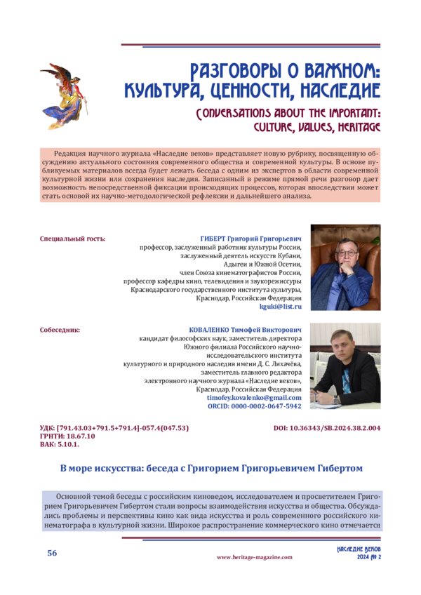 Т. В. Коваленко: Здравствуйте, Григорий Григорьевич. От имени редакции поздравляю Вас с юбилеем! Этим интервью журнал «Наследие веков» открывает новую постоянную рубрику. Наша беседа относится к особому жанру — научному интервью. Мы будем вести, по большей части, теоретический разговор, обсуждая проблемы взаимодействия искусства и общества, кино и книги в структуре современной культурной жизни и практике сохранения культурного наследия, которым Вы, помимо просветительской деятельности, тоже посвятили немало времени. Итак, первый вопрос: какой статус имеет кино в современной культуре и насколько, на Ваш взгляд, этот статус детерминируется культурной динамикой?