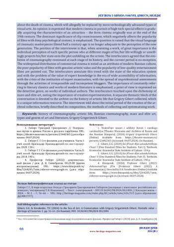 Основной темой беседы с российским киноведом, исследователем и просветителем Григорием Григорьевичем Гибертом стали вопросы взаимодействия искусства и общества. Обсуждались проблемы и перспективы кино как вида искусства и роль современного российского кинематографа в культурной жизни. Широкое распространение коммерческого кино отмечается как атрибут современной российской культуры, указывается на слабую известность кинолент, обладающих подлинной художественной ценностью, и на популярность некачественных развлекательных фильмов. Собеседники затронули дихотомию массового и элитарного искусства, подчеркнув значимость творческого эксперимента. Подчеркнута важность постоянного обращения к произведениям классической и современной литературы, выражена точка зрения на детективный жанр, творчество отдельных авторов. Завершающий тематический блок беседы посвящен собранному Г. Г. Гибертом архиву документов по истории художественной жизни, представляющему собой уникальный информационный ресурс.