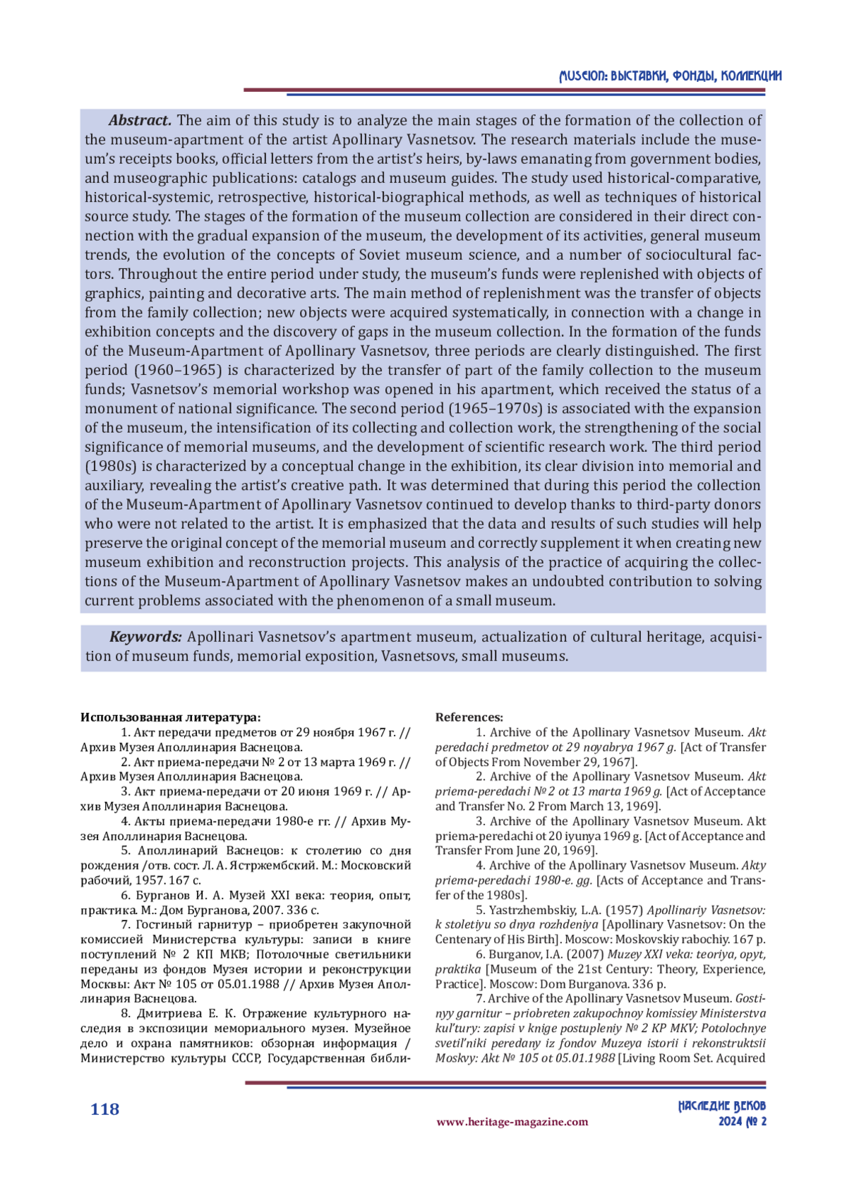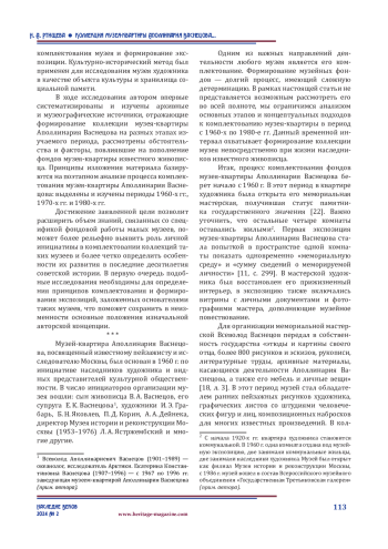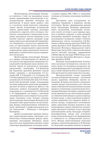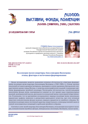 Целью исследования является выявление основных обстоятельств и факторов формирования коллекции музея-квартиры Аполлинария Васнецова в 1960–1980-х гг. Основу научных изысканий составили архивные материалы, хранящиеся в музее художника, Центральном государственном архиве города Москвы, а также ряд музеографических изданий, отражающих проблему формирования музейной коллекции. Рассмотрены обстоятельства, способствовавшие пополнению фондов музея, подчеркивается влияние на этот процесс ряда социокультурных явлений, музееведческой мысли, деятельности основателей музея и культурной общественности. Установлено, что на протяжении исследованного периода коллекция музея пополнялась предметами графики, живописи и декоративно-прикладного искусства, при этом основным средством комплектования фондов являлась передача предметов из семейного собрания. Пополнение коллекции имело системный характер, осуществлялось в непосредственной связи со сменой экспозиционных концепций и пробелами музейного собрания.