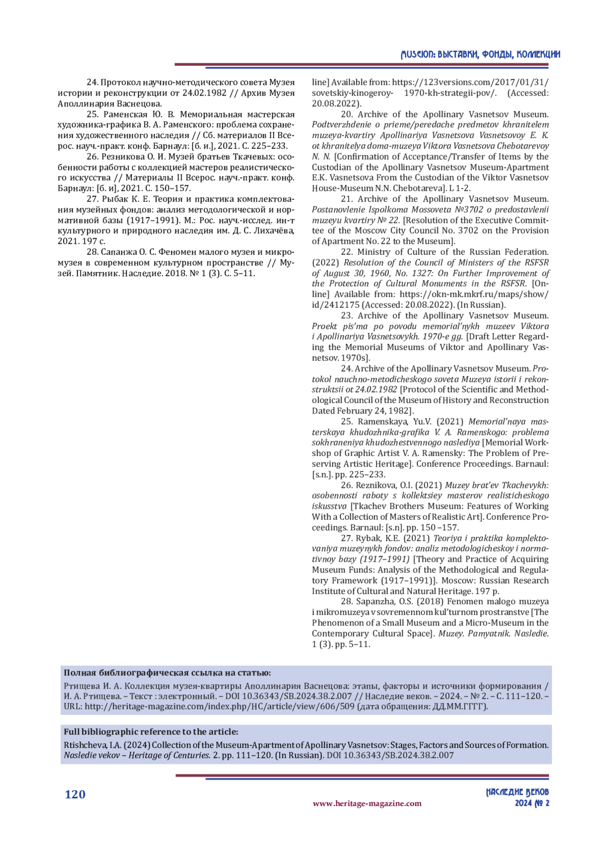 27. Рыбак К. Е. Теория и практика комплектования музейных фондов: анализ методологической и нормативной базы (1917–1991). М.: Рос. науч.-исслед. ин-т культурного и природного наследия им. Д. С. Лихачёва, 2021. 197 с.