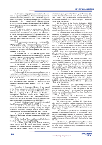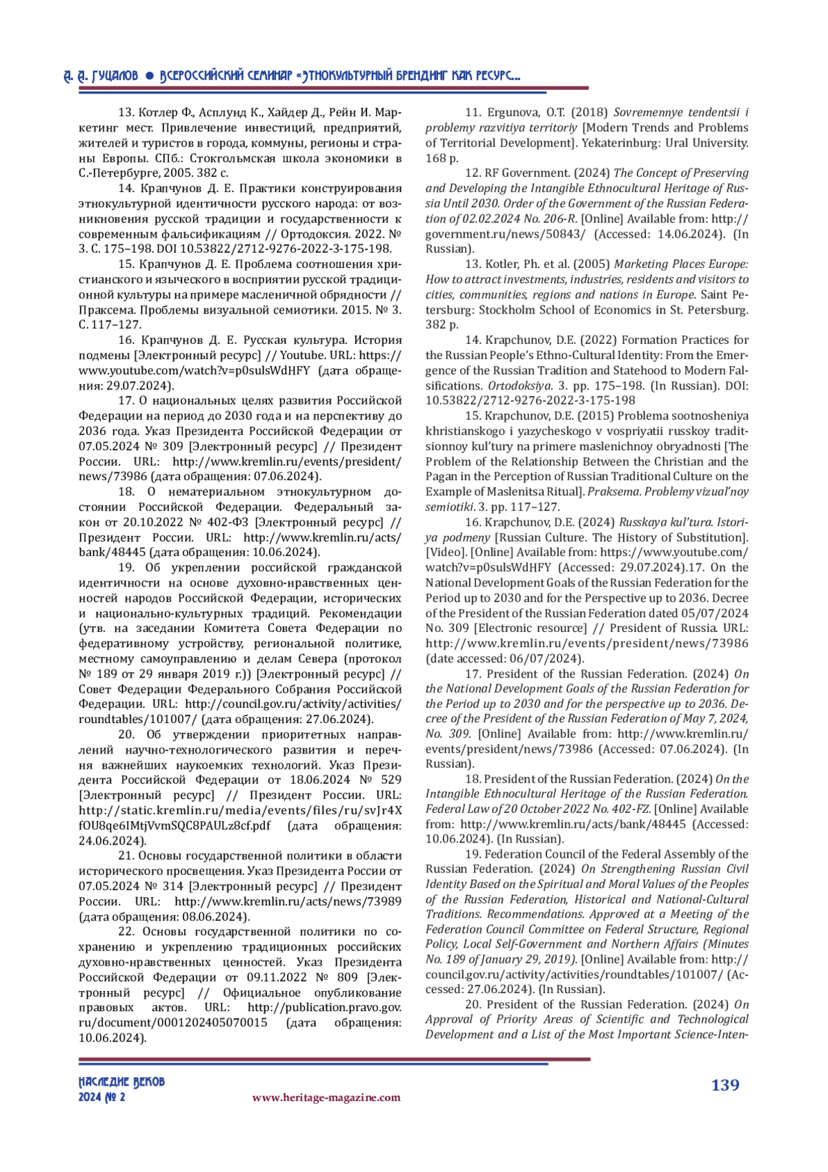 12. Концепция сохранения и развития нематериального этнокультурного достояния России до 2030 года. Распоряжение Правительства РФ от 02.02.2024 № 206-р [Электронный ресурс] // Правительство России. URL: http://government.ru/news/50843/ (дата обращения: 14.06.2024). Inten13. Котлер Ф., Асплунд К., Хайдер Д., Рейн И. Маркетинг мест. Привлечение инвестиций, предприятий, жителей и туристов в города, коммуны, регионы и страны Европы. СПб.: Стокгольмская школа экономики в С.-Петербурге, 2005. 382 с.