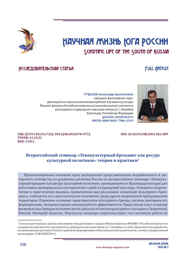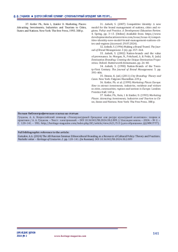 8. Гуцалов А. А. Основные характеристики культурного бренда // Культурное наследие России. 2019. № 2. С. 37–46.