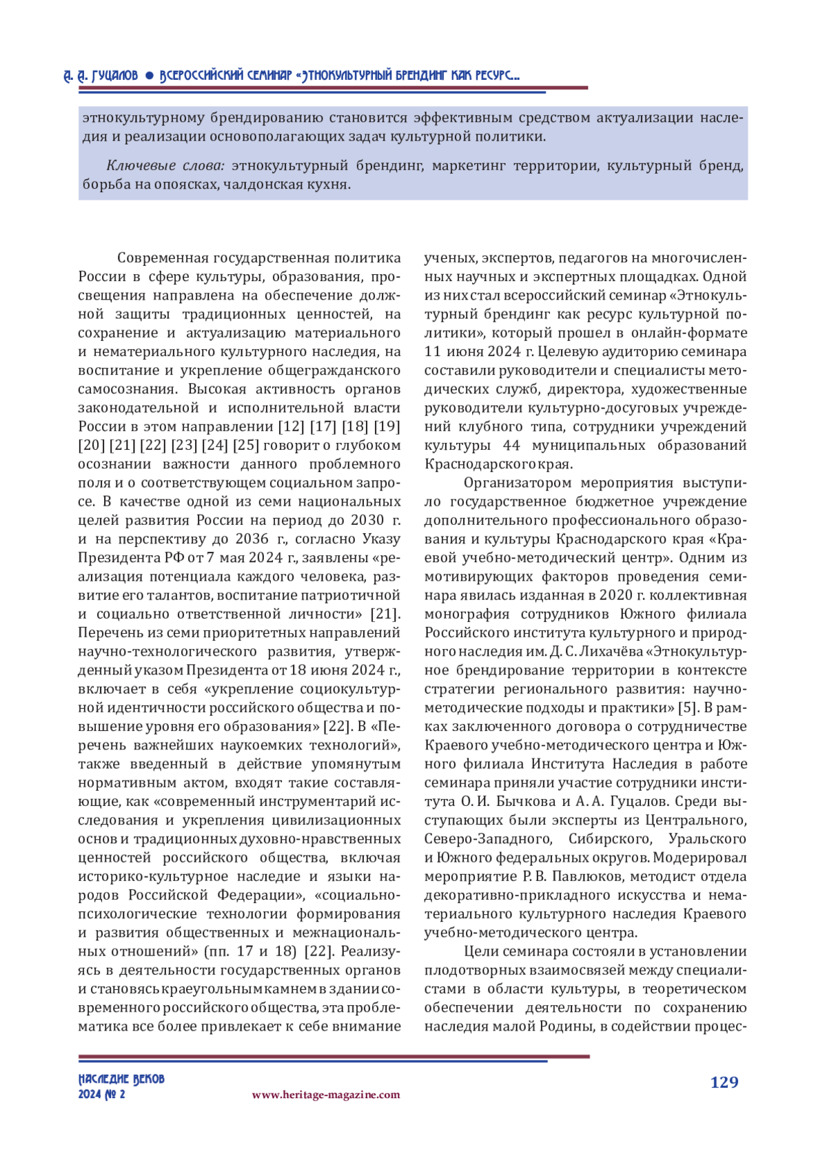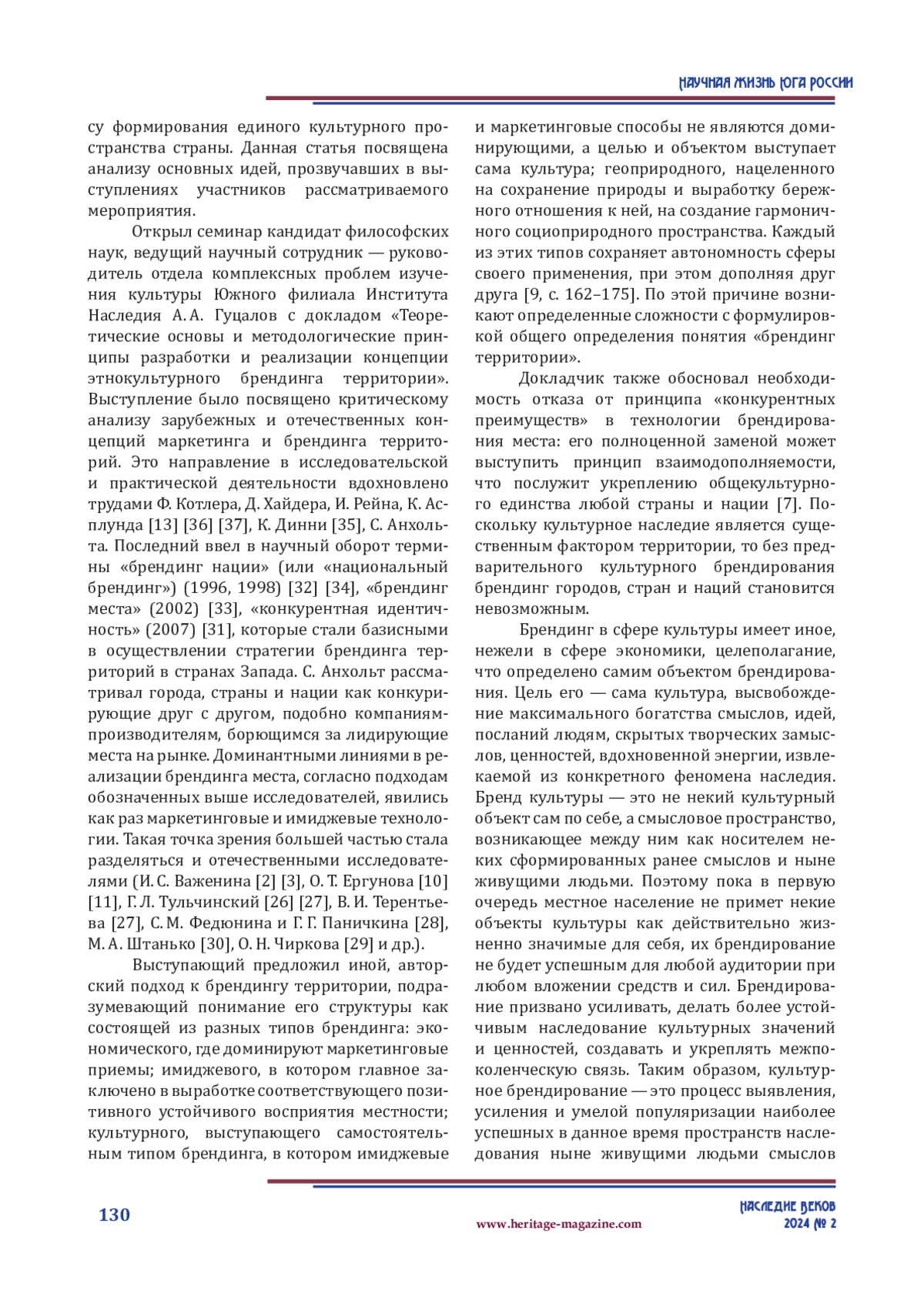 7. Гуцалов А. А. Культурный бренд и брендинг территории // Культурное наследие России. 2018. № 3. С. 84–90.