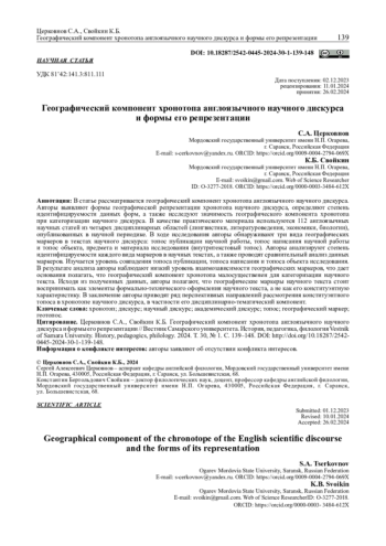 В статье рассматривается географический компонент хронотопа англоязычного научного дискурса. Авторы выявляют формы географической репрезентации хронотопа научного дискурса, определяют степень идентифицируемости данных форм, а также исследуют значимость географического компонента хронотопа при категоризации научного дискурса. В качестве практического материала используются 112 англоязычных научных статей из четырех дисциплинарных областей (лингвистики, литературоведения, экономики, биологии), опубликованных в научной периодике. В ходе исследования авторы обнаруживают три вида географических маркеров в текстах научного дискурса: топос публикации научной работы, топос написания научной работы и топос объекта, предмета и материала исследования (внутритекстовый топос). Авторы анализируют степень идентифицируемости каждого вида маркеров в научных текстах, а также проводят сравнительный анализ данных маркеров. Изучается уровень совпадения топоса публикации, топоса написания и топоса объекта исследования. В результате анализа авторы наблюдают низкий уровень взаимозависимости географических маркеров, что дает основания полагать, что географический компонент хронотопа малосущественен для категоризации научного текста. Исходя из полученных данных, авторы полагают, что географические маркеры научного текста стоит воспринимать как элементы формально-технического оформления научного текста, а не как его конституэнтную характеристику. В заключение авторы приводят ряд перспективных направлений рассмотрения конституэнтного топоса в хронотопе научного дискурса, в частности его дисциплинарно-тематический компонент.