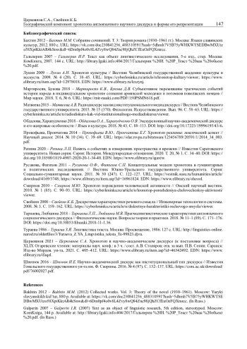 14. Церковнов 2021 - Церковнов С.А. Хронотоп в научно-академическом дискурсе (к постановке вопроса) // XLIX Огаревские чтения: материалы науч. конф.: в 3 ч. / сост. А.В. Столяров; отв. за вып. П.В. Сенин. Саранск: Изд-во Мордов. ун-та, 2021. С. 405-412. URL: item.asp?id=46342492. EDN: IFAQEL